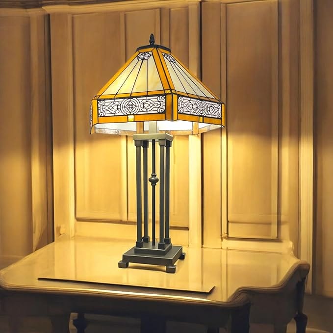 Transform your living space with this exquisite Oriental Art Decor table lamp, featuring a stunning hexagonal Tiffany-style stained glass shade. The shade measures 41 centimetres in diameter and showcases a mesmerising blend of amber and cream hues, adorned with intricate geometric patterns and designs. The lamp stands 65 centimetres tall on an elegant metal column base, finished in a sophisticated antique bronze tone. The base features four decorative pillars with a central ornamental detail, creating a perfect balance of stability and style. This statement piece accommodates two ES/E27 bulbs, providing warm, ambient lighting through its artistically crafted glass panels. The 1.5-metre cable includes a convenient in-line switch for easy operation. Whether placed in your study, living room, or bedroom, this lamp serves as both a functional light source and a captivating piece of decorative art that adds a touch of timeless elegance to any interior setting.